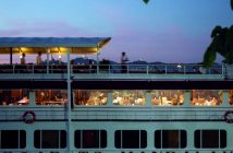 The sprawling observation deck is the ship’s showpiece, with its scalloped canopy, dipping pool, cocktail bar and outdoor-living-room lounges. A fitness room, nightly entertainment, spa rooms, world-class cuisine and an attentive staff round out the luxury.