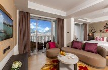The Deluxe Suite Room is a large and posh living space overlooking the pool. The room is 90 square meters and comes fully equipped with a King-sized bed, a walk-in closet, dining room, living room and a chill-out sundeck.