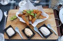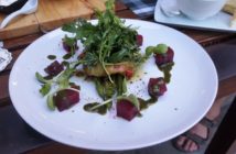 First up on the night we dined was a selection of Appetizers; a creation-of-the-day being a type of ‘gâteau d’aubergine’ with goat’s cheese centre, artfully surrounded by refreshing Beetroot and topped with Thai Basil – sourced from the back garden. This was followed by the shared Asian Platter; individual tempura prawns, calamari, spring rolls and samosa accompanied by a selection of three dipping sauces – tartare, aioli or lime pickle with mayonnaise.