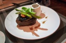 Mains sampled were also a combination of ‘Chef’s creation’ and à la carte. First up was the Special; roasted Codfish on spring onion mash, dressed with an exquisite vierge made from sun dried tomatoes (prepared on the estate), olive oil & capers, and garnished with estate-growth asparagus. A second main dish melded the cultures; slow-roasted Pork Belly (superbly crackled) served with Asian greens, Shitake mushrooms and served in green pepper sauce on a pilaf of one-year-old, Thai Hom Mali Rice. Also from the menu, a perfect, Black Angus tenderloin steak, served with Portobello mushrooms and asparagus, with a red-wine sauce on the side. The steak came with a side-dish of what may be Hua Hin’s finest chips – chunky-cut and crispy.