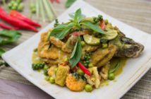 ‘Pla Proud Duean’. A delectable, deep fried whole sea bass and mixed seafood, in traditional green curry sauce, and prepared with Pirom’s unique flair for enhancing spices and rich, proprietary sauce.