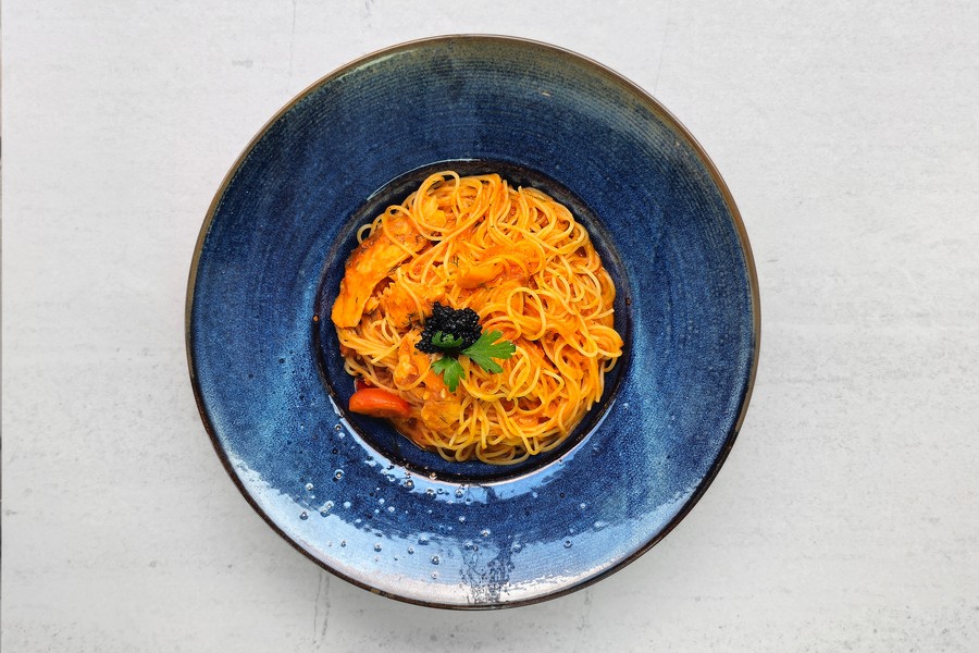 For starters, we sampled three salad dishes. A larb-style tuna and salmon salad with avocado and crunchy rice crackers. The Brezza Salad with grilled prawns and chicken breast pieces with a classic Cocktail Sauce dressing. And a Salmon Salad with grilled salmon fillet, fresh salad leaves including radicchio, clove-spiced beetroot pieces, orange and avocado, all topped with generous dollops of salmon roe. All the salad dressings were served on the side, providing a choice of the amount to add. A fresh, light and seafood-centric start to the meal.
