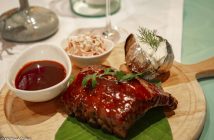 The Mediterranean Grilled Salmon – pan cooked to order and served with blanched asparagus spears, basil flavoured potato mash and sundried tomato aioli. A fish lover’s delight. And to round out the mains, the Texas BBQ Pork Spare Ribs accompanied by a cream cheese topped baked potato and a serve of coleslaw. The ribs glistening with the sticky BBQ sauce and a bowl of that sweet and tangy sauce is on the side for further indulgence. That sorted the meat lover on our table.