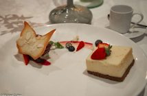 To finish the meal, Chef Pong served us three desserts starting with Dark Chocolate & Chili Fondant. The small chocolate cake with a crisp outer shell and warm chocolate filling oozed forth as the spoon cut through the petite confection. The plate decorated artistically with a delicate chocolate lattice twirl and an almond tuile (biscuit) in the shape of a butterfly, and white chocolate ice-cream.