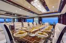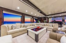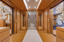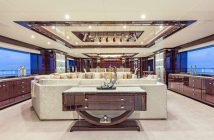 The dynamic exterior design of “Spectre” accommodates spacious interiors by Benetti’s Interior Style Department, which has created a modern yacht embellished by steel detailing and sculpted glazed surfaces. The atmosphere conjures up the mood of 1930s Art Deco found in New Orleans and Florida, which draws its inspiration from late 19th century French Liberty style.