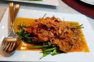 For mains – a Lobster Ravioli with a tasty cream sauce; confit duck leg sitting upon a pumpkin mash with roasted cherry tomatoes and a flavour filled Jus; and our table’s absolute favourite – the Stir-fried beef and morning glory in a coconut and peanut sauce (Phra Ram Long Srong) with just the perfect amount of spice. A very moreish dish!