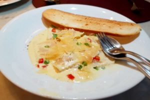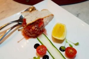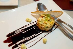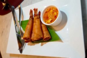 From the starters of this menu, our table chose – a Yellow Fin Tuna Tartare, with hints of pepper and a well-balanced lime dressing; Prawn Spring Rolls filled with a whole prawn and suitably complemented by a spicy salsa; and a Curry Chicken salad.