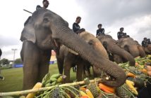 The tournament started Thursday morning March 9th with a Monk Blessing that saw the monks placing sacred garlands over the necks of the elephants. Thailand’s last elephant spirit men (Kru Ba Yai), who possess spiritual control over all of Thailand’s elephants presided over the early morning rituals. The Elephants certainly enjoyed themselves as they were served a fruit buffet.
