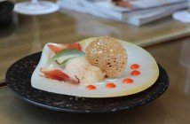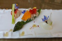 Our dining experience was memorably extraordinary and started with Green Asparagus from Pertuis France, stuffed Alaskan King Crab, white Asparagus and Panna Cotta, an Italian cooked crème. The presentation of the dish, as all of the dishes we tried, was as visually stunning as it was delicious. Next came Divied Scallop “a la plancha” from Hokkaido, Iberico Palenta and Piquillo Coulis which was artful in all senses. We also had the 48 hour cooked Wagyu Short Rib with textures of Beetroot and Teriyaki Pearls. Choosing a favorite of the 3 would be difficult but the 48 hour cooked Wagyu just melted in my mouth and would probably take top honors. For desert we had the Almond Parfait with Mascarpone Cream and Arabica Coffee Jelly. All the flavors of a tiramisu, again beautifully presented.